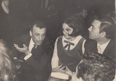 Ayhan Işık ve Belgin Doruk 1962 yapımı Alkışlarla Yaşıyorum filminin setinde bir sahnenin çekimde. Solda Yönetmen Nejat Saydam